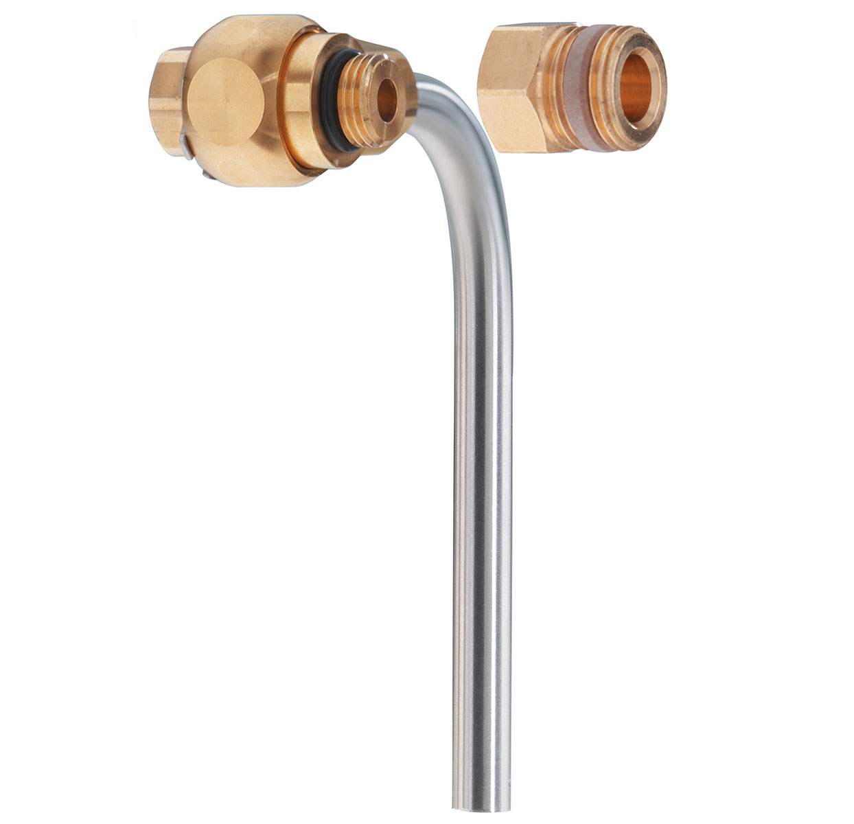 Nach DVGW W 579 (P), Werkstoff nach DIN 50930 Teil 6 bzw. UBA Liste 03/2018, DVGW zertifiziert, ¼“ Anschlussgewinde, mit beiliegendem selbstdichtendem Adapter auf 3/8″, Rotguss Gehäusekörper 360° drehbar, absperrbar mittels beiliegendem 6-kant Schlüssel, abflammbares Edelstahl Auslaufrohr mit Ø 9 mm – 360° drehbar, Klemmring sowie Überwurf verliersicher aufgebördelt