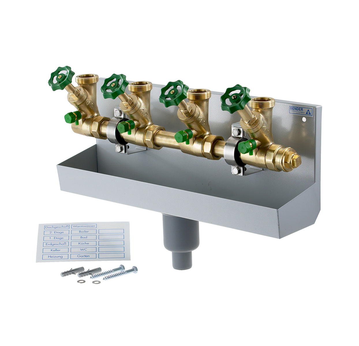 bestehend aus: 1 Abzweig T- Ventil KFR nach DIN EN 13959 (Einbau links) sowie 3 Abzweig T-Ventile Freistrom nach DIN EN 1213, Abschlusskappe rechts, Kunststoff Kompaktsifon, Stahl Entleerungsrinne pulverbeschichtet / rostfrei für 4-fach Verteiler, Breite 550 mm, Satz Etiketten, Satz Befestigung